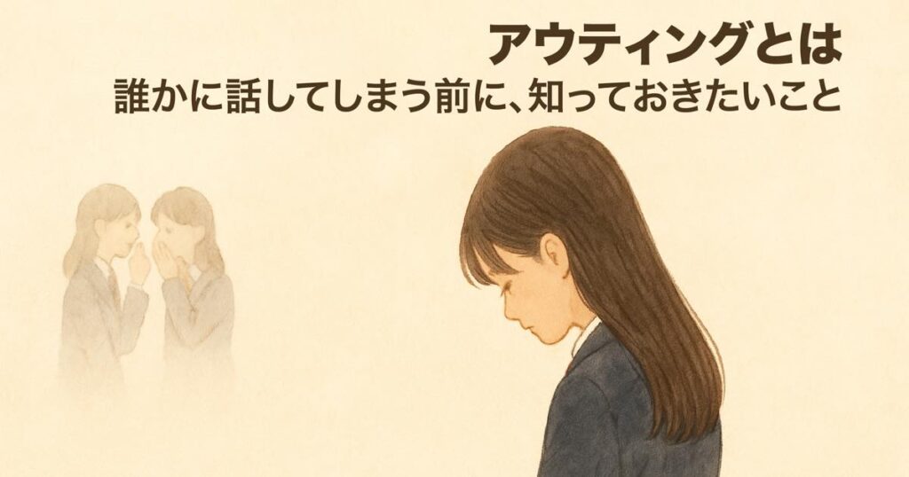 アウティングとは、本人の同意なく、他人がその人の性的指向や性自認などの個人情報を第三者に伝えてしまう行為のことです。たとえ軽い気持ちや冗談でも、それは相手にとって深い心の傷となることがあります。 私はその言葉の意味を、「実際に自分がアウテ... -